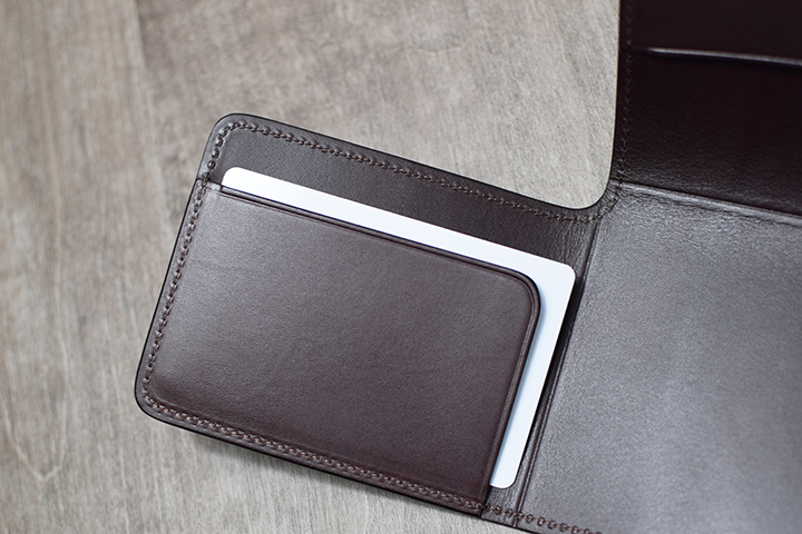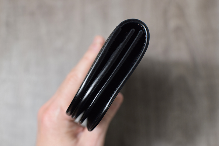 フラップの裏側に当たる内装部分は1列2段のカード段とマチなしの札室収納部で構成されています。