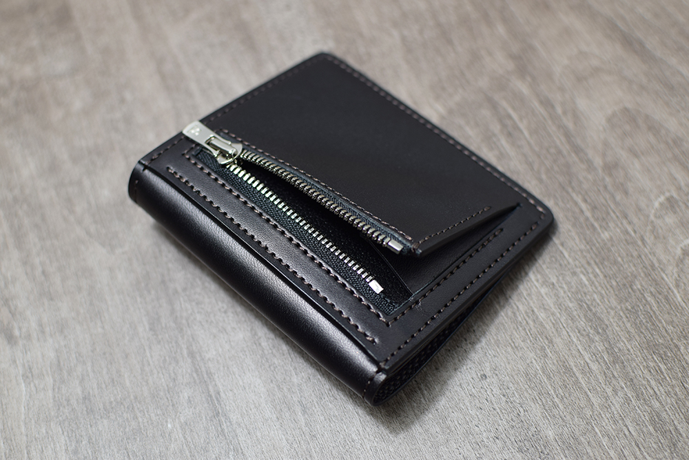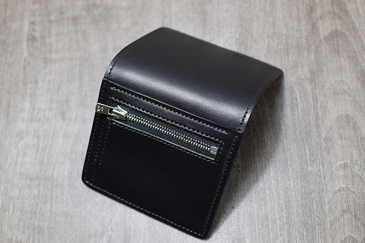 外装の背面にはファスナー式のコインケースを備えています。小振りのコインケースですが片マチ式で取り出しやすさにも配慮された設計です。(こちらに沢山のコインを入れてご使用されますとファスナー故障の原因に繋がる可能性がありますのでどうかご注意くださいませ。)