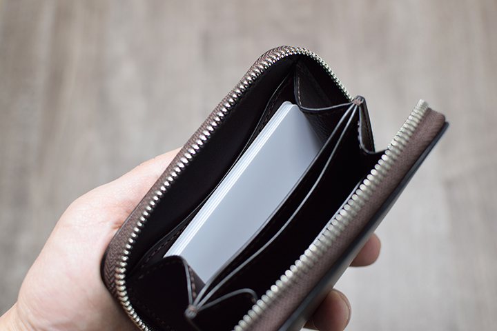 ラウンドファスナー式のLAFAROは手のひらサイズのコンパクトなモデルですが、20.5mmの厚みのボディで見た目以上の収納力を備えています。