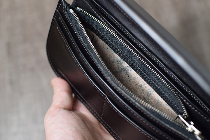 コインケースはファスナーで開閉します。舟形に開くため非常に中身が見やすい仕様です。