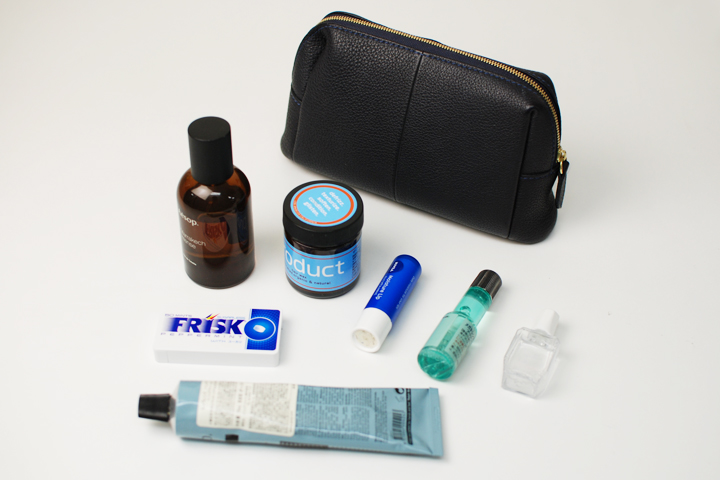 こちらは実際にスタッフが使用しているシュランケンカーフRUELLEのネイビーです。 中に収納しているモノはリップクリーム、ハンドクリーム、オードパルファム、目薬、眼鏡クリーナー、フリスク、WAXといったエチケット用品を中心に7点が入っています。