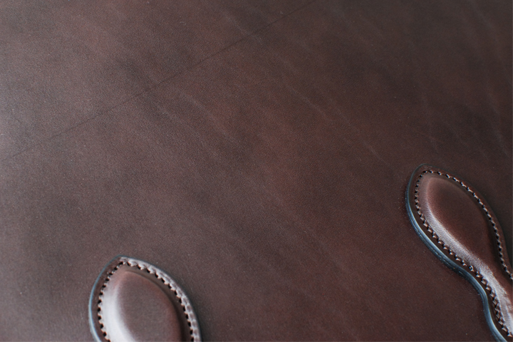 イングリッシュブライドルレザーはしなやかでありながらもコシや粘りを残した皮革で、一般的なブライドルレザーに見られるギン面の割れも起こりにくい素材です。