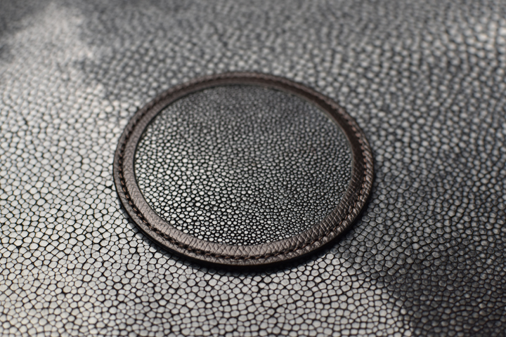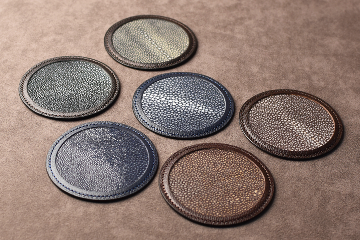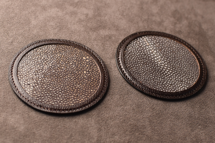 ガルーシャ(エイ革)と型押しを施したイングリッシュブライドルレザーを使用した革製のコースターが入荷いたしました。