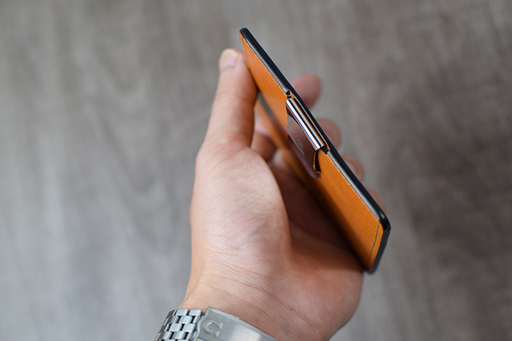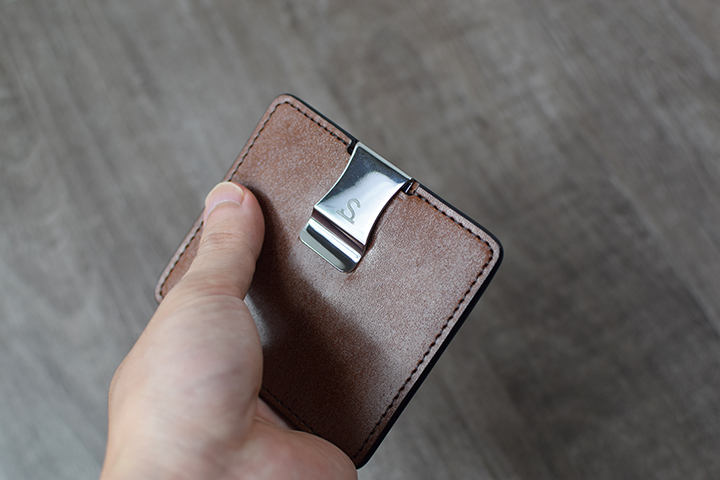 本体と接続した状態では、画像のようにオリジナルクリップに折りたたんだ紙幣やカードを挟みます。