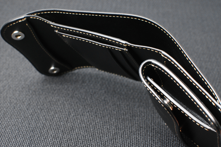 コインケース部分は外装と同様にフラップ式で、2点のホックによって留められています。 ケースは両側にマチを備えたポケットになっており、ポケット内部にはカード類を挟み込んで収納が出来る仕切パーツを備えています。