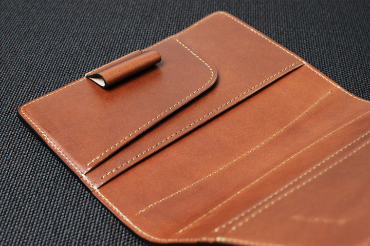 本シリーズの外装にはアメリカ・ホーウィン社製のシェルコードバンを用いています。 牛革の3倍とも言われる繊維密度の高さによってしなやか且つ肌理の細かい革質をしており、使い込むことで徐々に表れる独特な鈍い光沢は金属を思わせるような力強い印象があります。