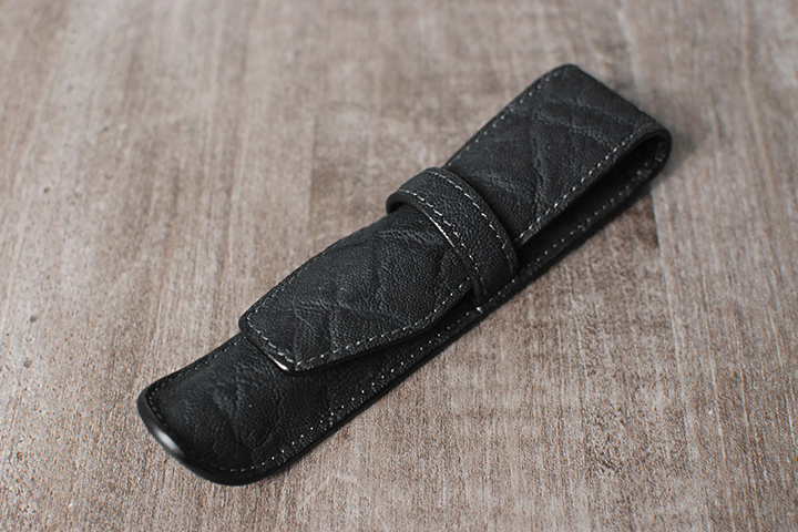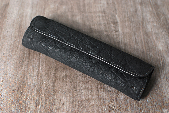 貴重なエレファントレザーのボディ部分を用いて製作したPeek A booⅠです。お気に入りのペンを収納するのに相応しい特別なペンケースに仕上げています。カラーはブラックのみのご用意となります。