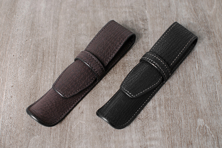 国産のヨシキリザメを外装に用いた一本挿しペンケースです。内装にはアメリカ牛革のイングリッシュブライドルを組み合わせています。カラーはブラックとダークブラウンの2色でご用意しています。