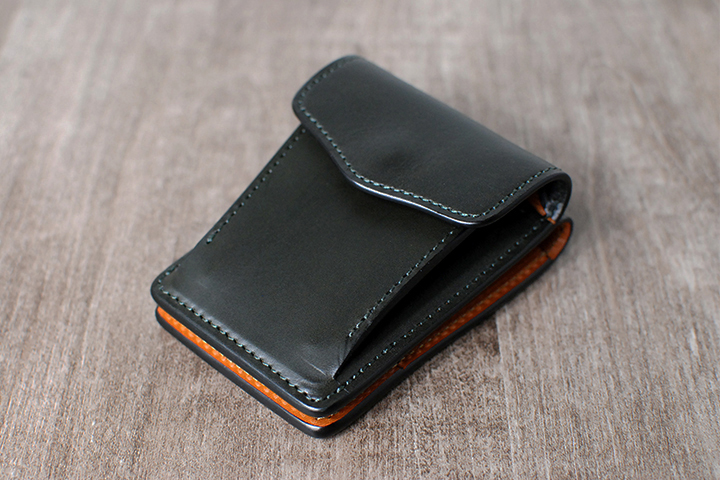 外装にドイツ・ぺリンガー社のシュランケンカーフを用いたコインケースです。内装はサドルプルアップを合わせています。カラーはブラックのみのご用意です。
