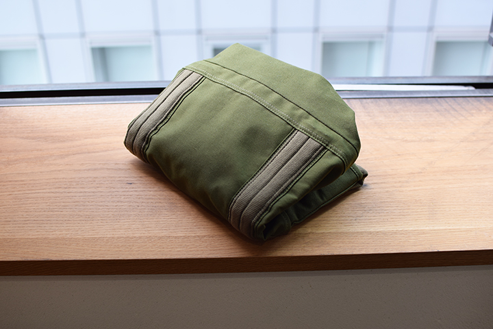 耐久性を重視した分、ナイロンに比べて少し厚みが出ますが、折りたたんでもあまり嵩張らないので、通勤用バッグに仕込んで帰宅時にスーパーでたっぷりとお買い物ができます。