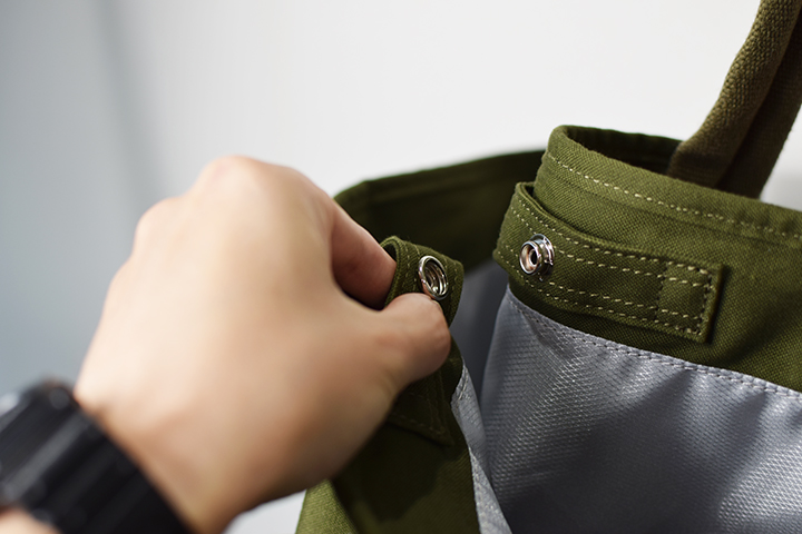 メイン収納部への入口中央にはホックを1点備えています。こちらのホックが装備されることにより、買い物した中身が外から見えにくくなります。またホックパーツの凸側と凹側それぞれに指を入れるスペースも設けているため、片手でスピーディーな開閉が可能です。