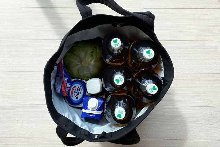 とにかく容量の大きなエコバッグです。実際にスタッフが買い物で使用した時の画像がこちらです。