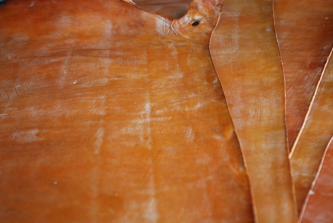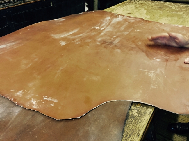鞣しを終えた状態の皮革は「カリアー」と呼ばれる仕上げ担当の職人によって、加脂や染色が施されます。