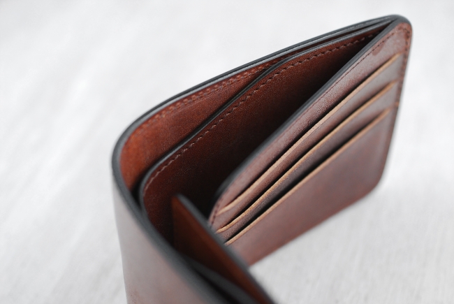 ブライドルレザーは元々イギリスにおいて手綱や轡(くつわ)といった馬具用の素材として開発された皮革で、一般的な革製品とは用途が異なるため、タンニン鞣しの皮革に内部の繊維質に至るまで蜜蝋やタロウ(精製された動物油)等を含むワックスを染み込ませることで高い堅牢性や耐久・耐水性を与えた素材になります。
