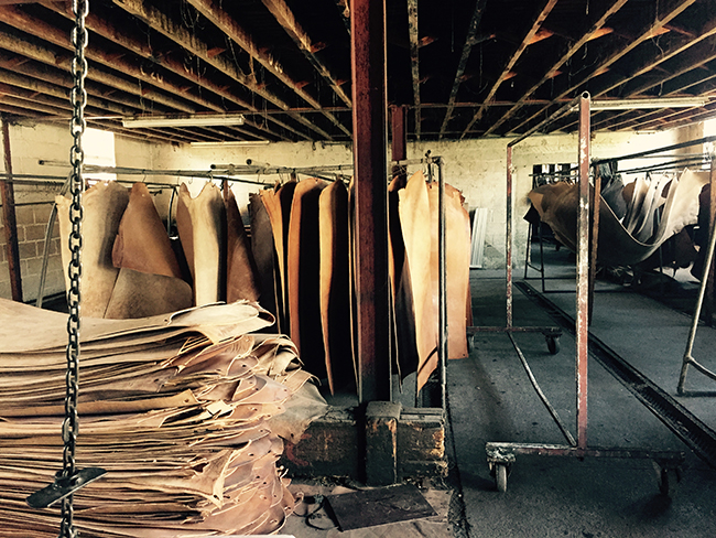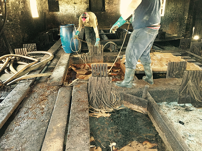その間タンニン濃度の薄い槽から段階を踏んで順番に濃い槽に移し替えていきます。 タンナー(=皮鞣し業者)によって漬け込む期間は異なりますが、時間をかければかけるほど皮の内部の繊維にしっかりタンニンの成分が染み込み、堅牢な革に仕上がると言われています。