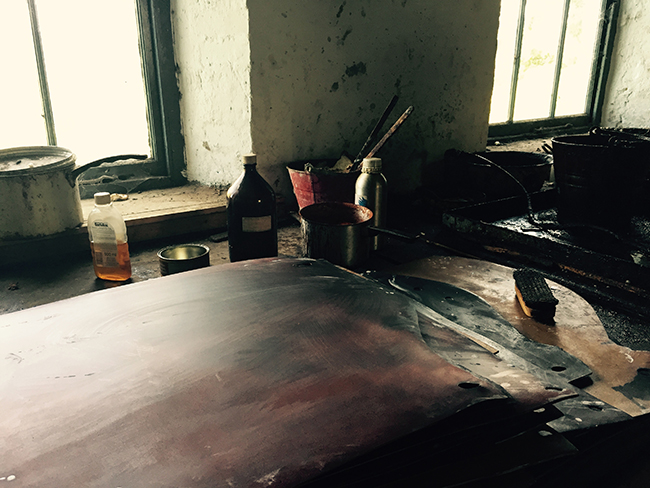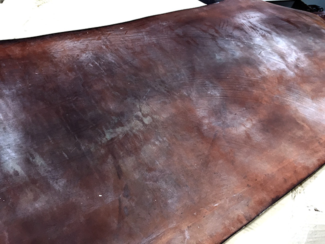 出来上がった無染色のナチュラル状態の革に、染色とワックス(蜜ロウ、タロウ、植物性油等)を塗り込む作業を行います。