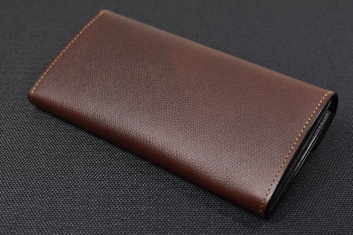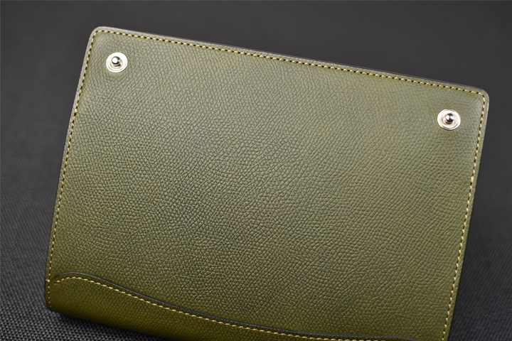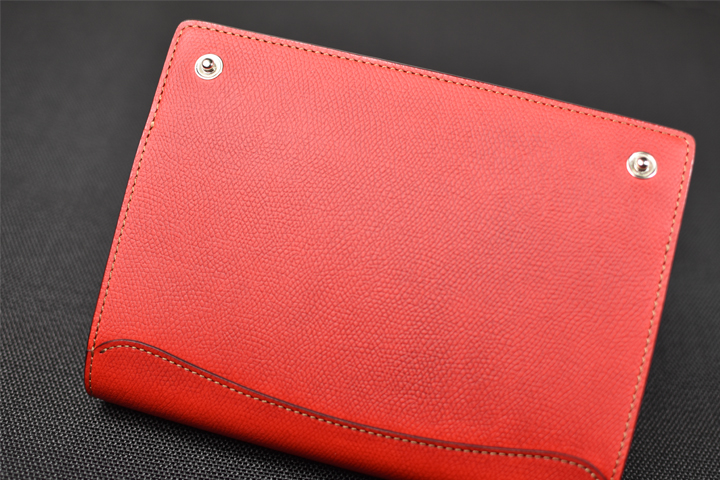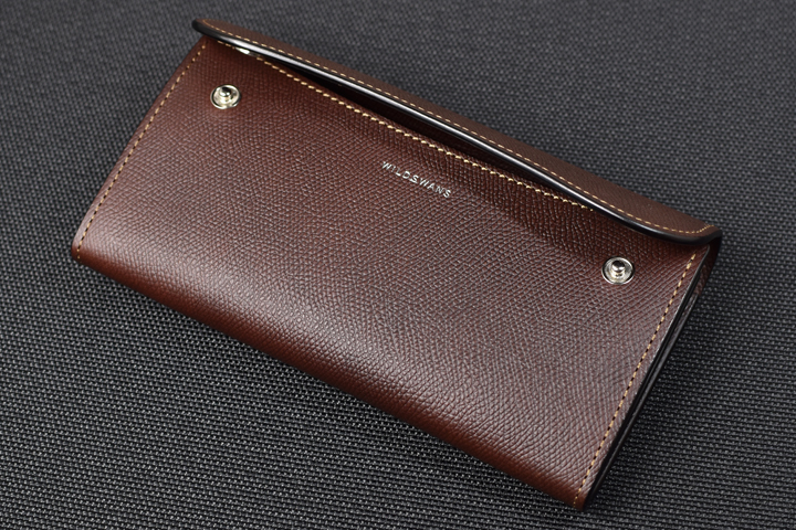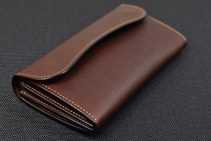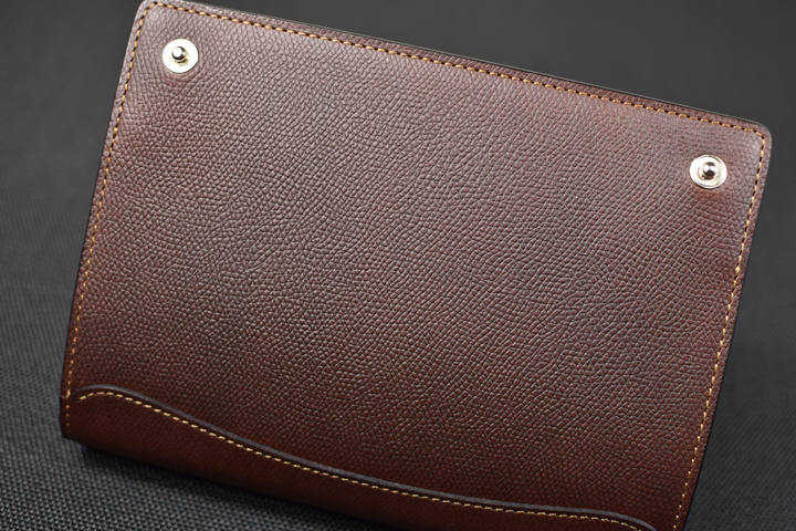 フラップ部分は留め具を設けておらず、余計なものを削ぎ落した外観はスマートで皮革の質感や表情がより強調されるようです。 お使い始めから暫くは皮革のハリによってフラップは開いたままですが、革が馴染むことによって徐々に閉じて参ります。