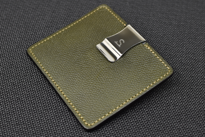 こちらがMINIMALの表面です。 表面にはクリップ金具が取り付けられており、カードや折り畳んだ紙幣などを挟み込んで収納することが出来ます。