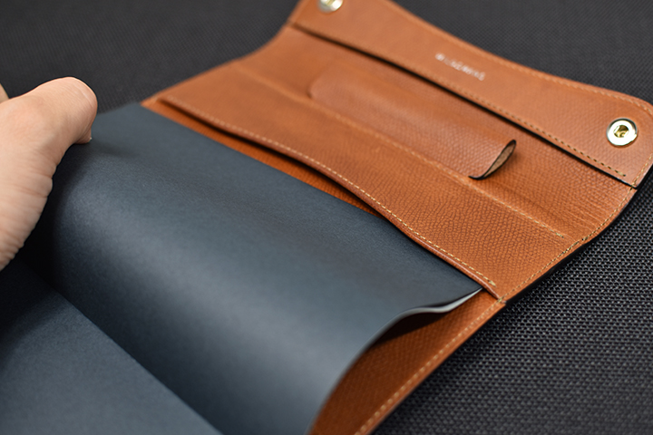 ノートの収納は容易で、内装の両端に設けられたポケットにノートの表紙と裏表紙をそれぞれ差し込めば完了です。