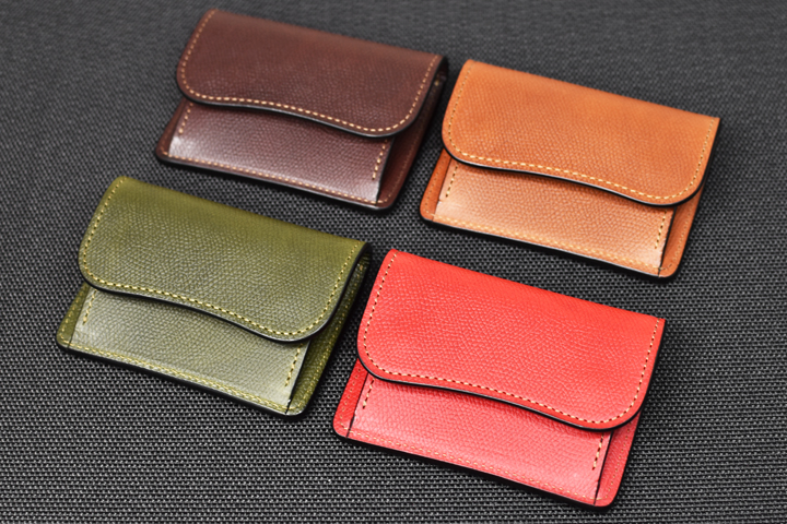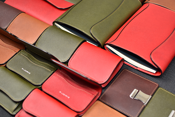 皮革の表面に凹凸を刻み付けることで独特の表情を与え、更に傷や摩擦への耐久性や繊維密度が引き締まることで皮革のハリが強まるなど、ミネルバリスシオに一味加えた皮革で革小物シリーズを製作しています。
