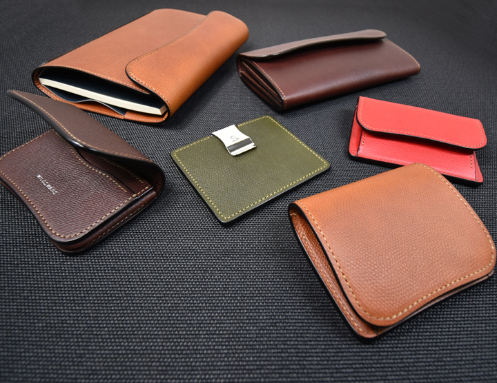 イタリアの名門タンナー、バダラッシ・カルロ社のミネルバリスシオに型押しを施した皮革 を用いた革小物6種をご紹介致しました。