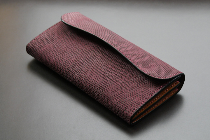 こちらは、ヌバックリザード・バーガンディを表板にあしらった長財布WAVEでございます。