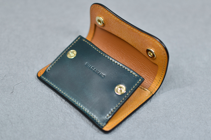 中央のカードポケットは縦方向、横方向に立体的に組み上げられており、その隣にコインケースが取り付けられています。