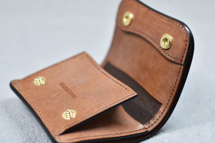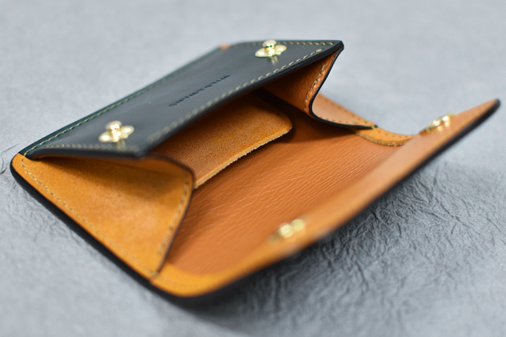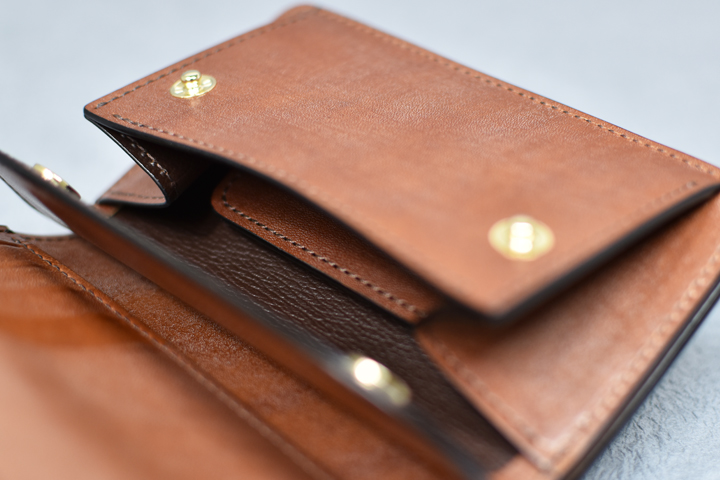 本当に丁度一万円札が収まるサイズのため、今回のようにハリの強い素材で製作された場合には初め少し窮屈に感じられることがありますが、程なく皮革が馴染むことで難なく収納できるようになります。