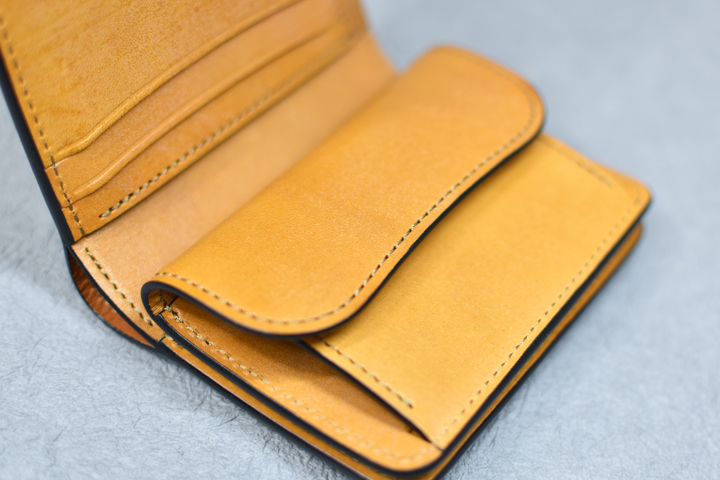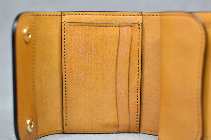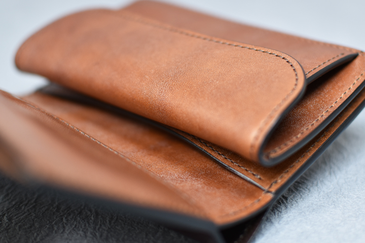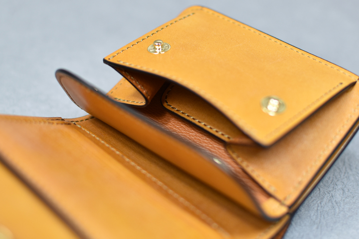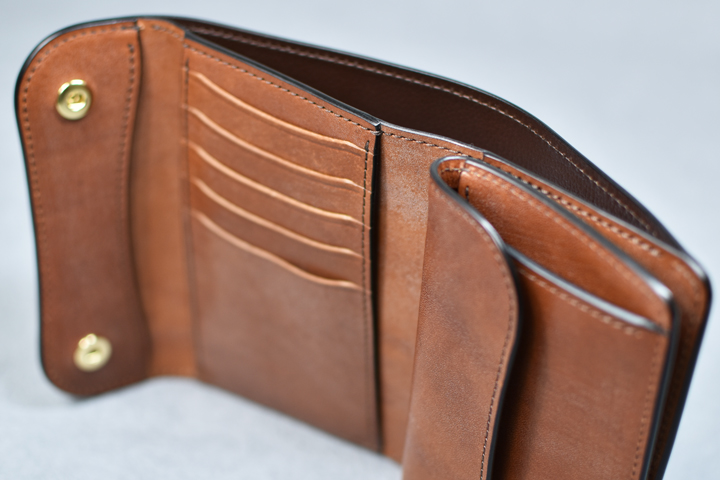 収納部のユニットを革で包み込んだ3つ折り財布、何層にも重なるパーツのコバが印象的なモデルです。