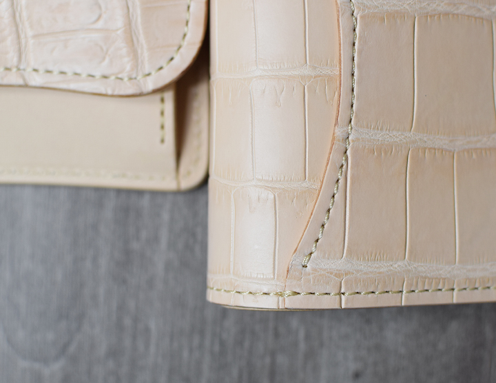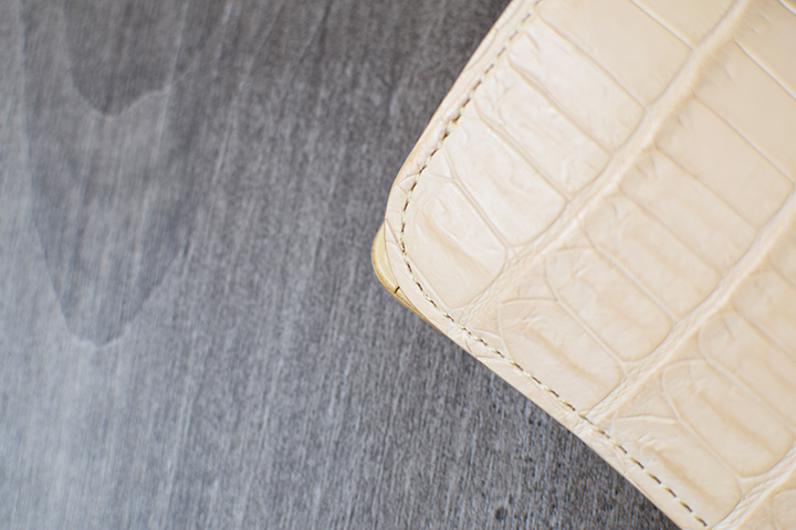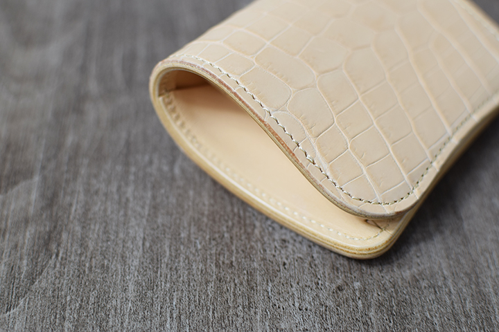 コバ(=革の裁断面)についても、他のWILDSWANSの小物や文具と同様に職人が丁寧に磨きをかけて仕上げています。今回のナチュラルカラーのクロコシリーズでは展開する4品全てが素磨きと呼ばれる、黒い染料を入れない見た目にも自然な仕上げを施しています。