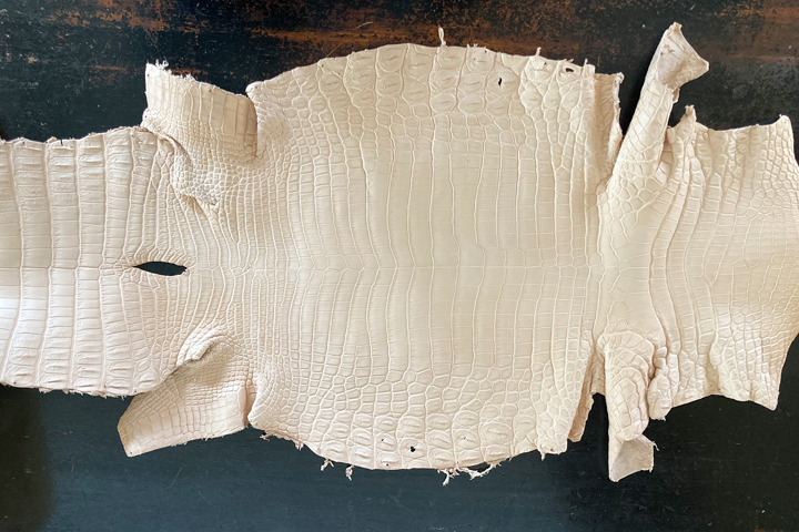 今回製作に用いたクロコダイルは、アフリカ大陸を中心に生息するナイルクロコです。斑柄については、腹部と尻尾の部分は長方形のような四角い「竹斑」のものが多く、腹部の両サイドにかけては丸い「丸斑」がメインの斑柄となります。斑柄は皮革の中心線から左右対称の物が多く、またスモールクロコに比べてナイルクロコの斑柄は比較的大きいために全体的に美しく、迫力のある見た目が特徴です。