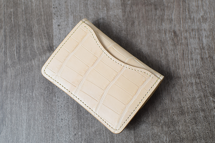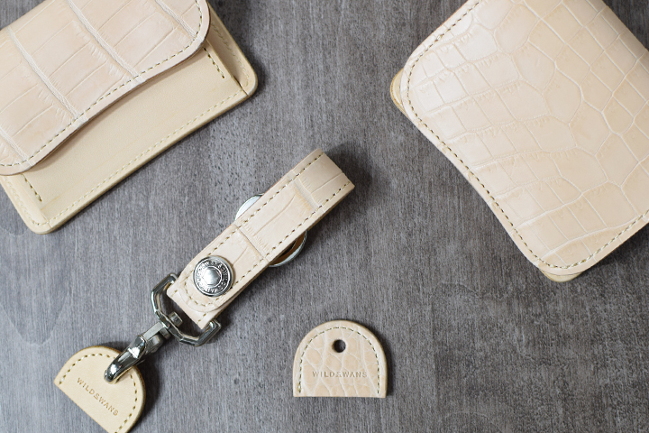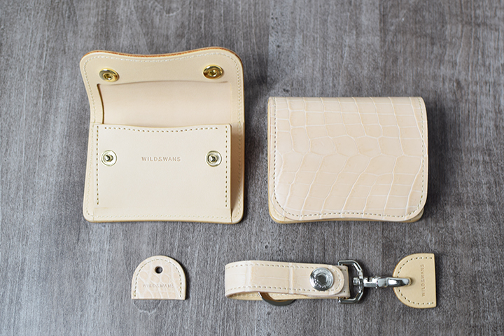 エキゾチックレザーの代表格であるクロコダイルは、WILDSWANSにおいて近年人気が急上昇している皮革の一つです。現在、WILDSWANSではブラックとチョコの2色のカラーを定番カラーとしてクロコダイルシリーズを展開していますが、今回、極めて珍しいナチュラルカラーのクロコダイルを入手することができましたので、少量ではありますがこちらを用いた革小物を製作させて頂きました。
