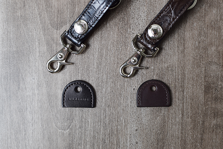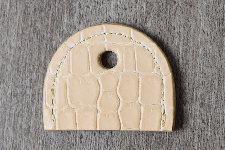現在、2色で展開している定番品のクロコBRANCH(ブラック、チョコ)のキーキャップは、両面にイングリッシュブライドルを用いた仕様となっていますが、今回ご用意させて頂いたナチュラルカラーのクロコKEYCAPでは、両面にクロコダイルのナチュラルカラーを用いた仕様でのご用意となります。