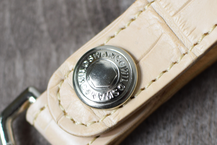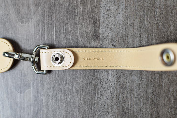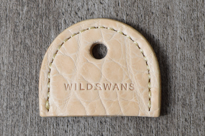帯の下部にはシルバーカラーのホックを備えています。7050番ホックと呼ばれる強力かつ頑丈なホックです。またこちらのホックには円を描くようにWILDSWANSのロゴが刻印されています。