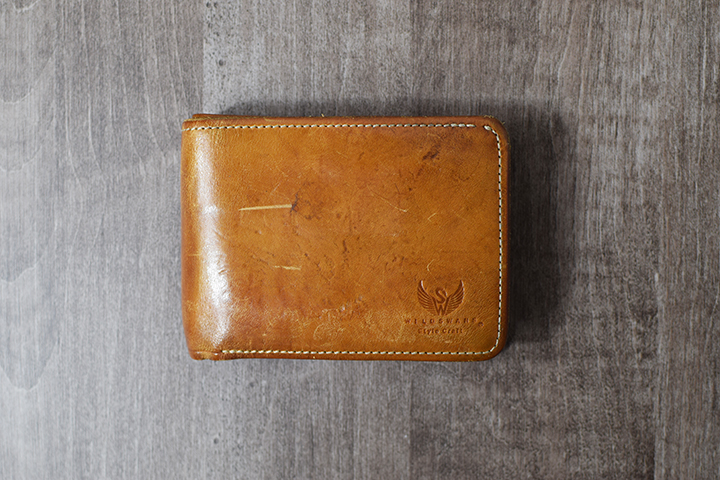 そのエイジングにも目を見張るものがあり、使用することで少しずつ表面はあめ色に変化して芳醇な光沢が現れます。ちなみにこちらの画像はスタッフが約1年半使用したサドルプルアップのナチュラルを用いた三つ折り財布・BYRNEのエイジングサンプルです。