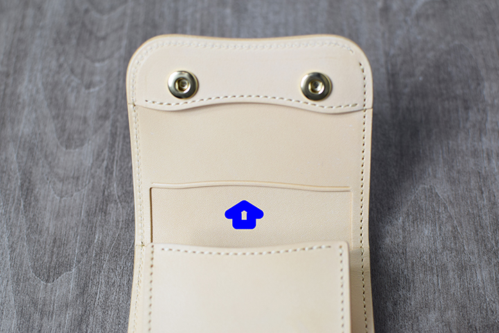 フラップの裏側にもカードを1枚程度収納できるポケットを備えていますが、カードがホックと干渉することから、こちらには紙製のカードを収納して頂きたいと思います。