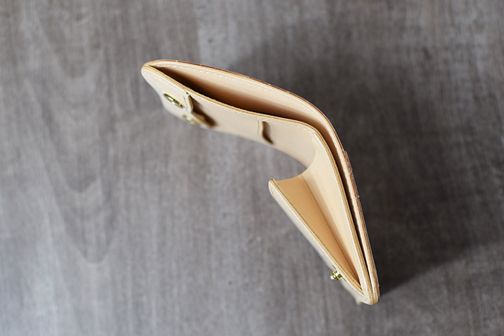 フラップは2点のホックを解除することで開きます。こちらもゴールドのホックに素押しのブランドロゴの仕様です。因みに内装は全てサドルプルアップのナチュラルです。