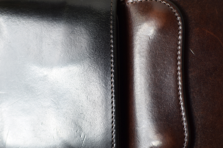 こちらも使用前のもの(画像左:サドルプルアップPALM/チョコ)と並べてご覧ください。使用前のものはブラックと同様にややマットな面持ちです。一方、使用3年(画像右:サドルプルアップENO/チョコ)のエイジングサンプルは全体に強い光沢を湛えています。