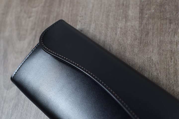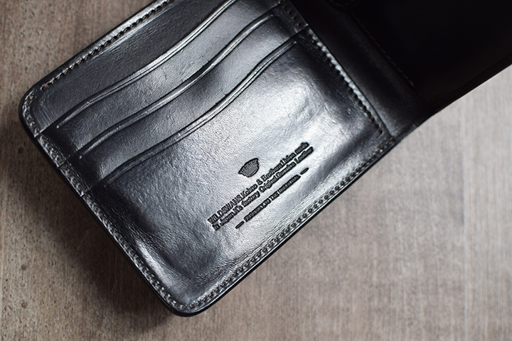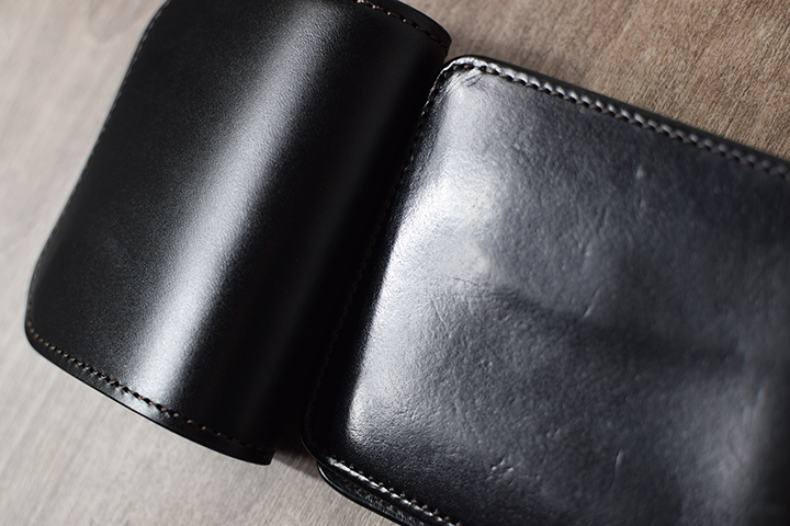 先ずはブラック。こちらは2年半程使用した二つ折り財布・サドルプルアップGROUNDER/ブラックのエイジングサンプルです。ブラックについては、色味の変化こそないものの透明感の強い光沢が皮革表面を覆っています。