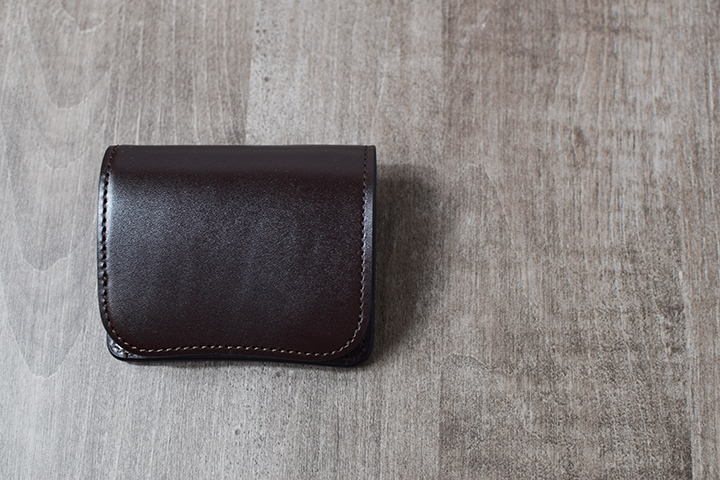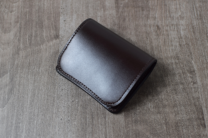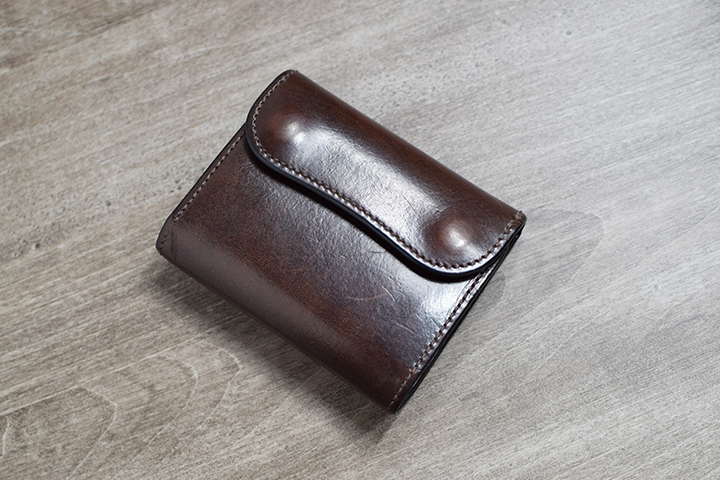 続いてチョコです。エイジングサンプルは、3年程使用した小型三つ折り財布・サドルプルアップENO/チョコです。こちらも皮革表面にはっきりとわかる光沢が現れています。