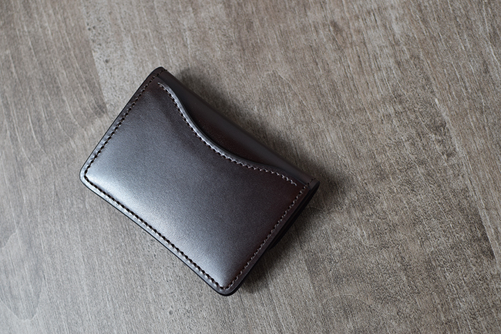 手ごろなサイズのGENERALは、ジャケットの内ポケットにも収納できるコンパクトな名刺入れです。フラップに留め具を備えていないため、お使い始めはサドルプルアップの強いハリ感により、フラップが開いた状態です。しかし、使用していくと革が馴染み自然にフラップが閉じるようになります。