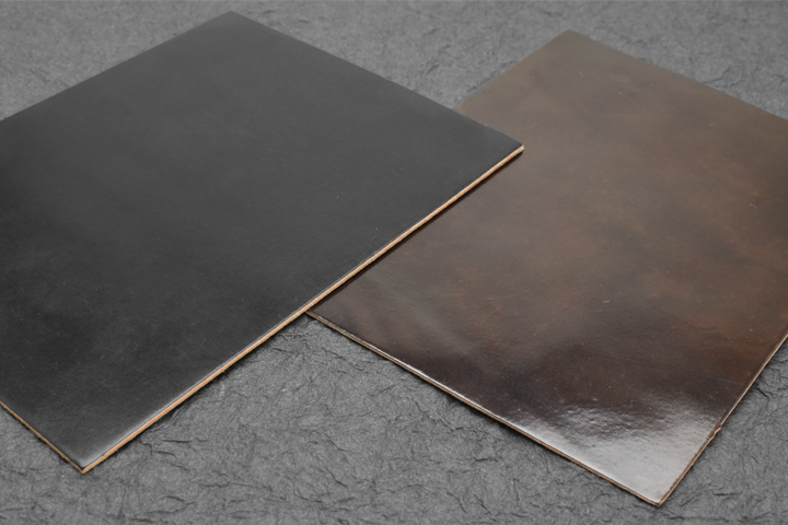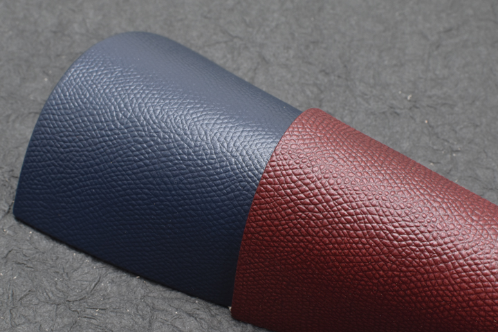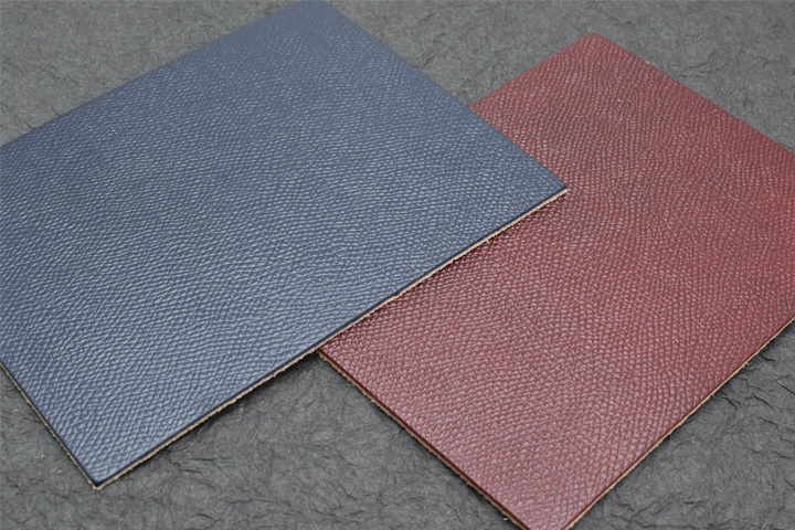 圧力と熱を加えることで皮革の表面にシボを刻み付けており、その際革が圧縮されるためにハリが強まり、また表面のシボによって傷が付きにくく、付いても目立ちにくいという特性も加わっています。