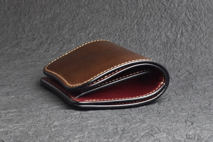 新品時、特に今回素材に用いられているコードバンや型押しのイングリッシュブライドルレザーはハリが強いために開こうとする力で膨らんで厚みがあるように見えますが、ご使用頂くにつれて革が馴染み、嵩が減って参ります。