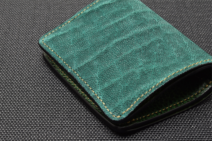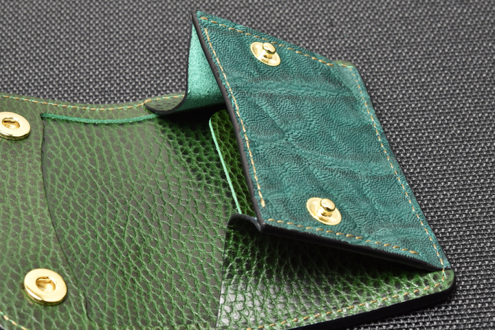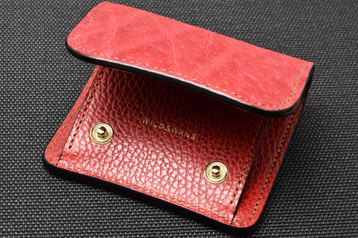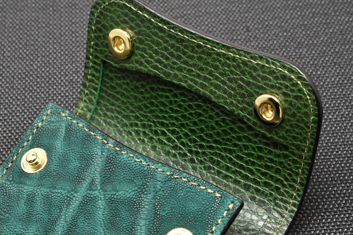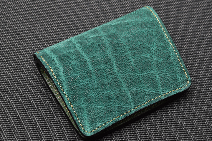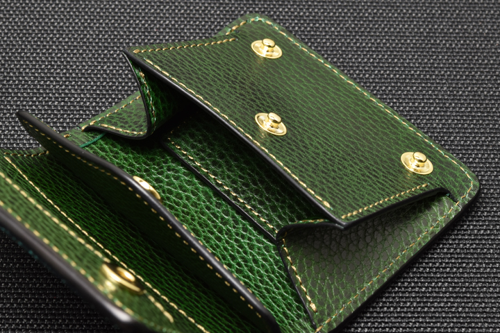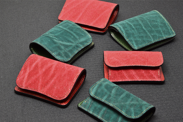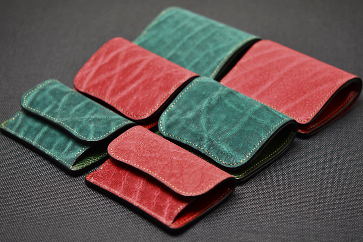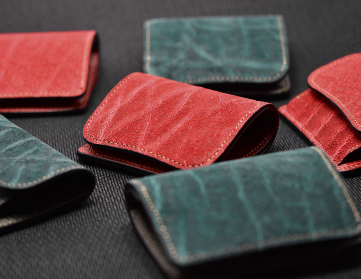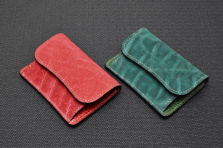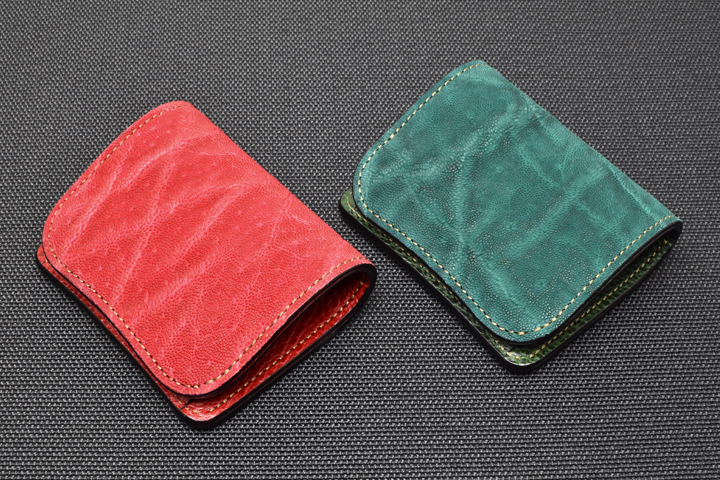 エレファントレザーと言えばブラックやグレーといったカラーが一般的ですが、今回はレッド、グリーンという鮮やかな色味に染め上げた2色の皮革を使用しています。