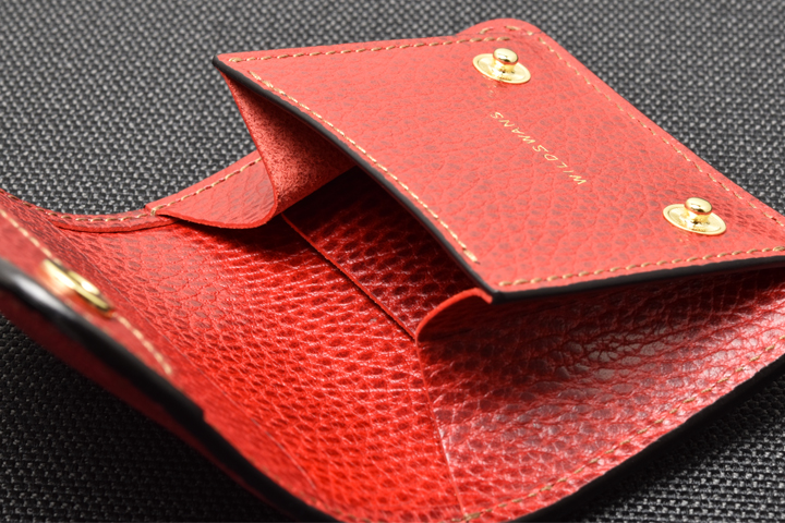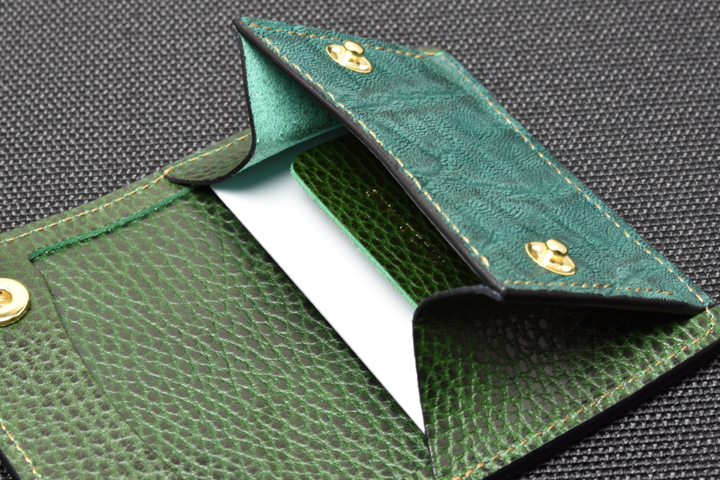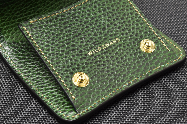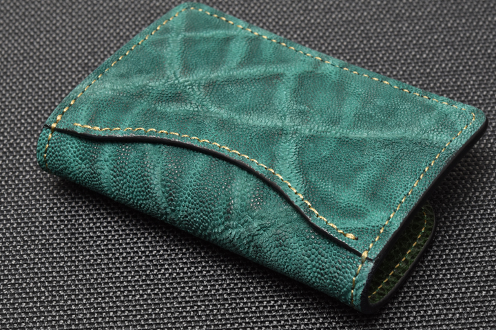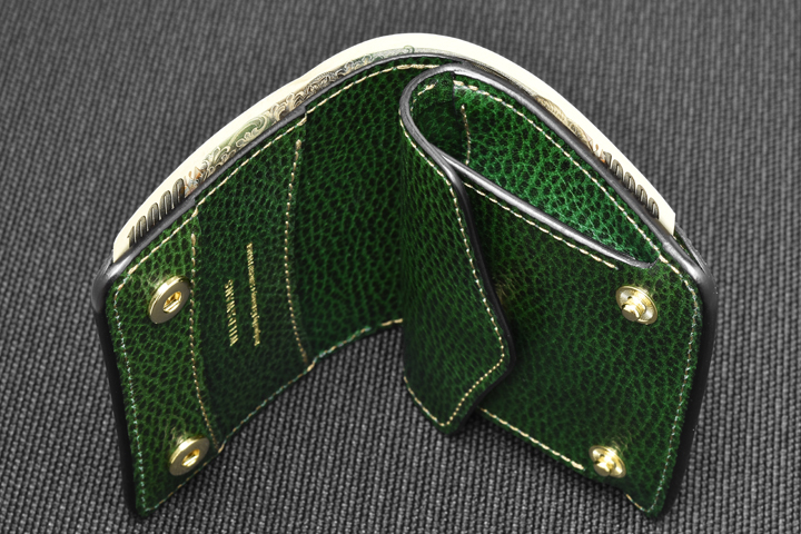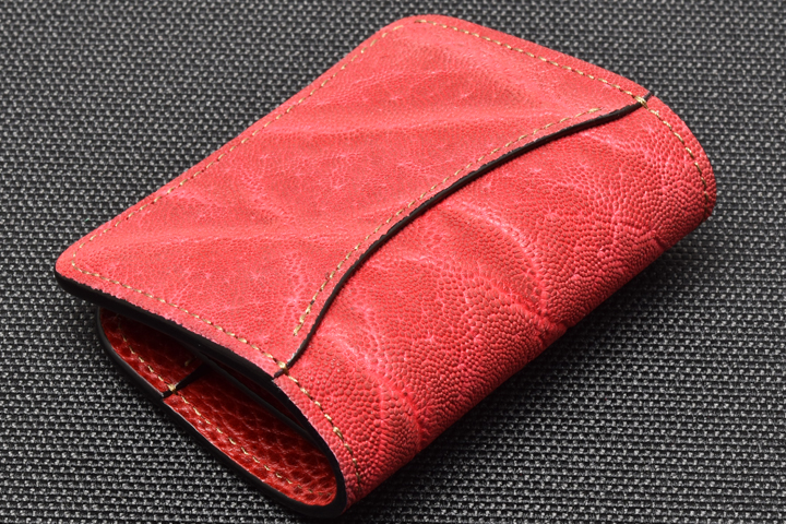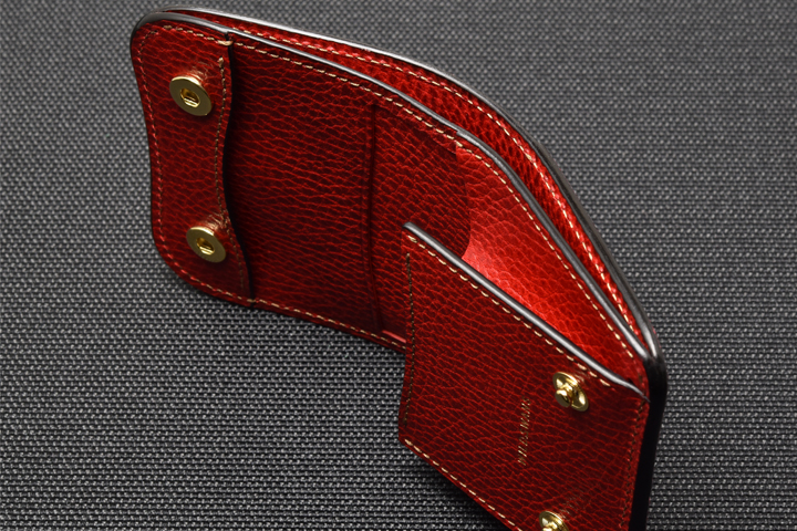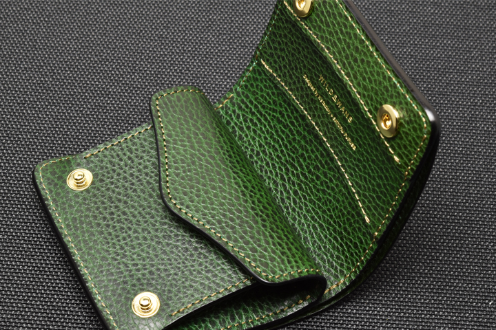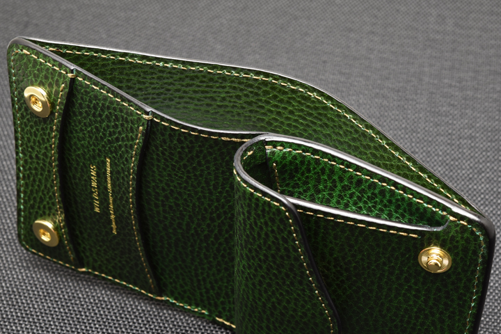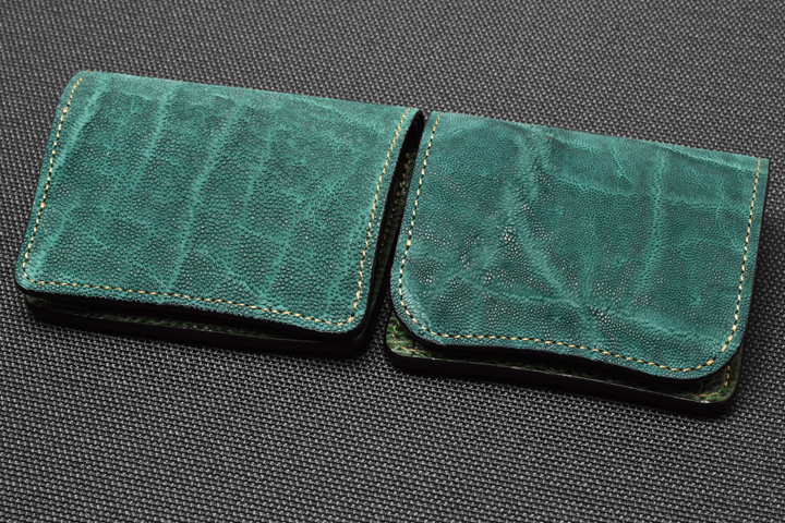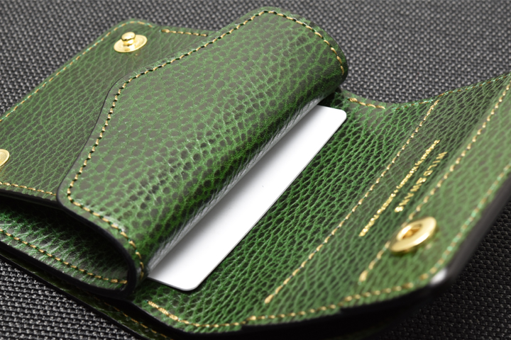 エレファントレザーと言えばブラックやグレーといったカラーが一般的ですが、今回はレッド、グリーンという鮮やかな色味に染め上げた2色の皮革を使用しています。