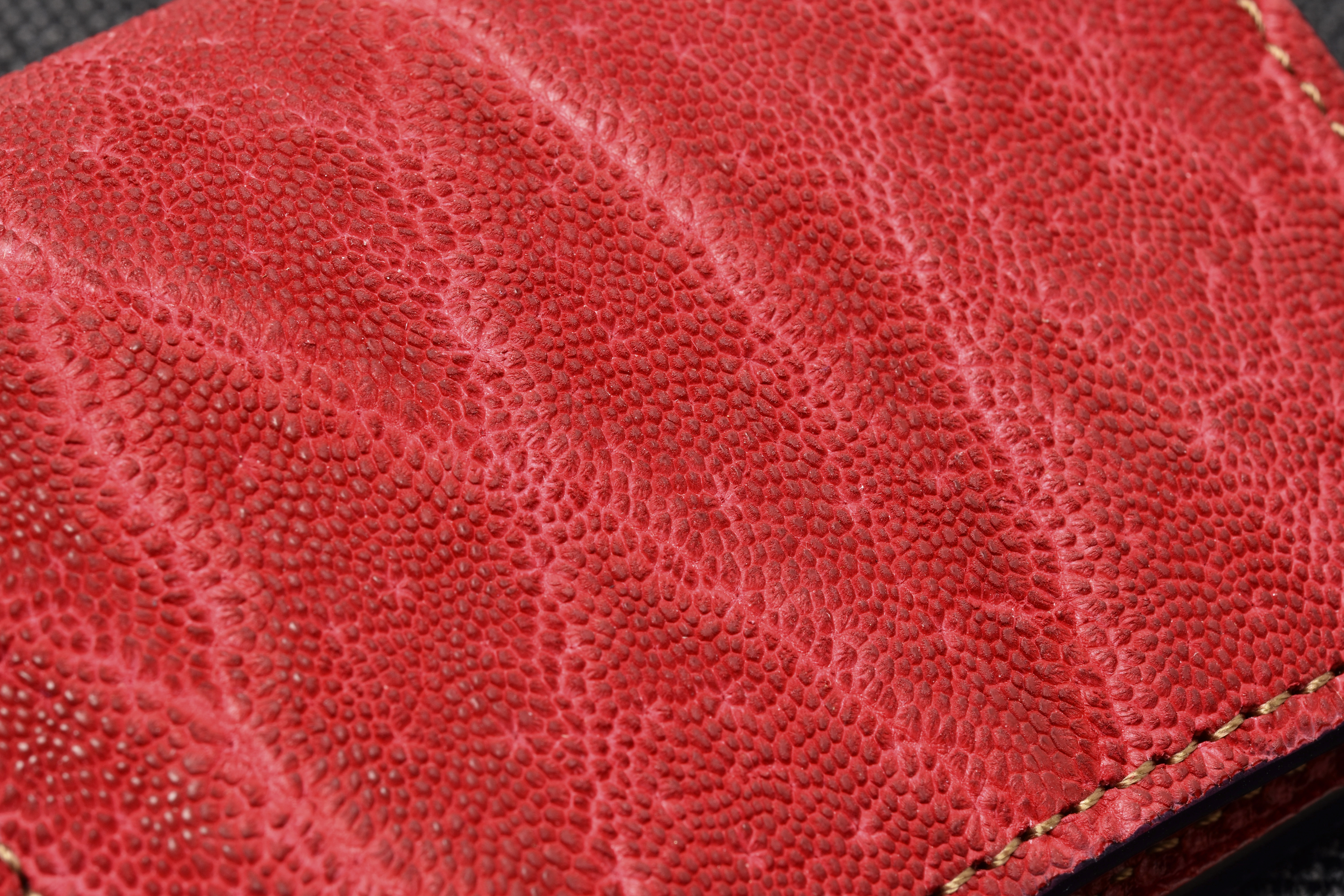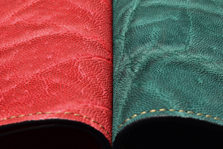 今回使用するドラーロはこのブッテーロに型押しを施した皮革で、カラーは外装に合わせレッド、グリーンをご用意いたしました。