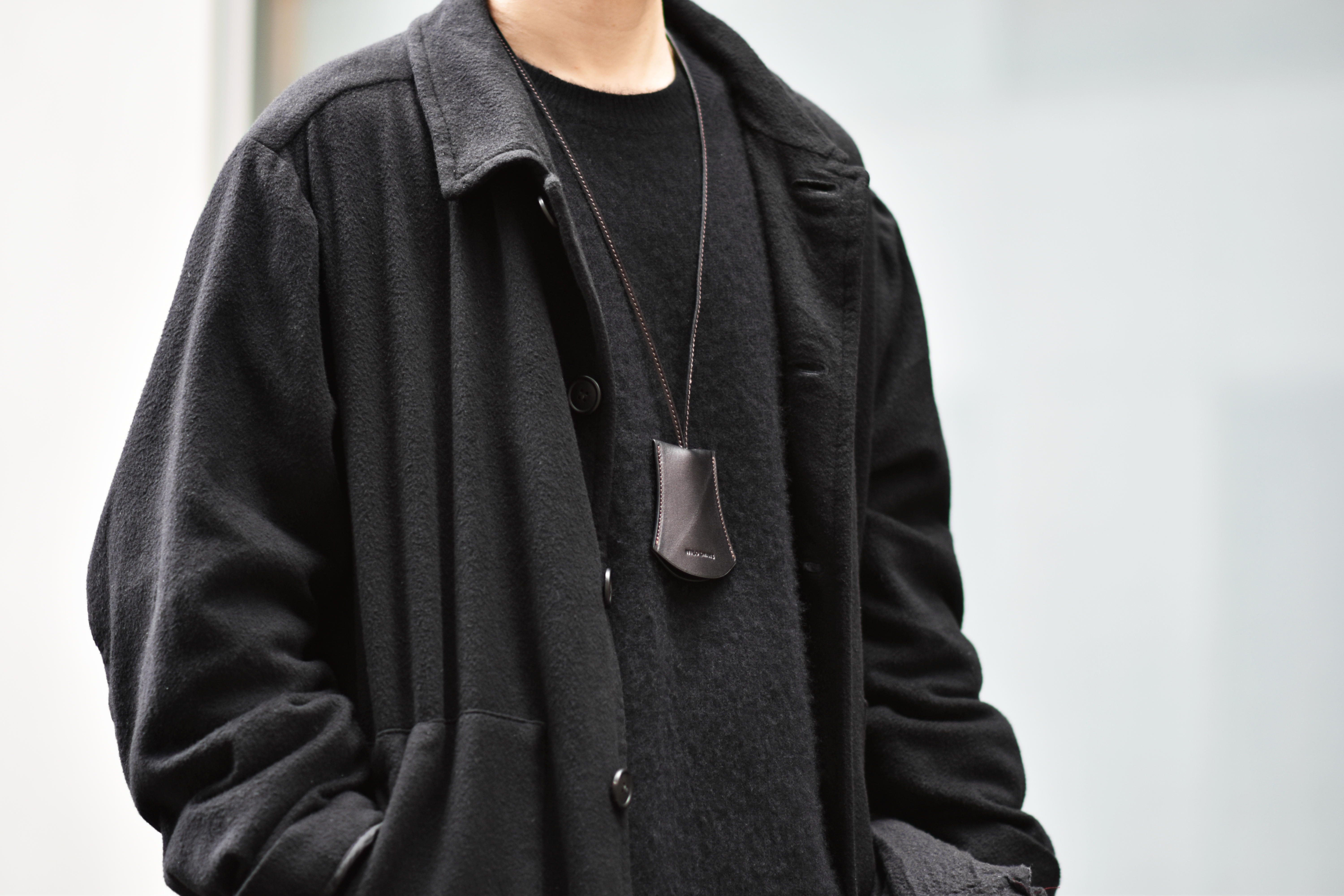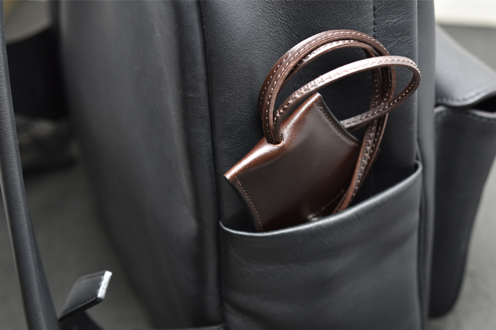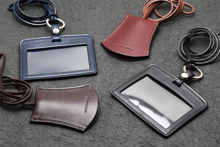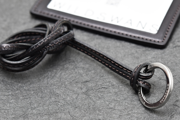 首から掛けて使用するため、移染を可能な限り防ぐ目的でコバ部分は通常のWILDSWANSの革小物に用いられる染料仕上げではなく、顔料仕上げにて製作されています。