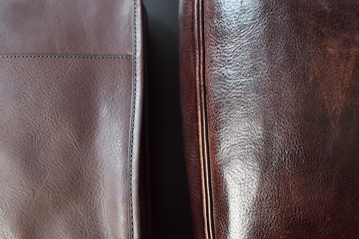変化の度合いを確認するために使用前(左)と使用後(右)のミネルバボックス/タバコを並べてみました。半年という比較的短い期間の中で、マットな使用前の表情からオイリーな面持ちに変化して色味も2トーン程濃く変化しています。オイリーとは言っても、特にベタつきはなく、あくまでも見た目の変化となります。