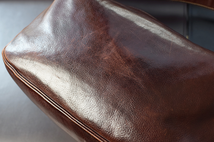 このシボ加工により、皮革表面にキズが入っても目立ちにくく、仮にキズが入ったとしても、ミネルバボックスの皮革内部の豊富な油分により、比較的薄いキズであればブラシ等で革を磨く、あるいは手で揉み込むなどして、キズについてはある程度修復することができます。さらに皮革表面に一定程度の艶が現れるとこの油分の膜により、水分や汚れなどによるシミもある程度防ぐことが可能です。ミネルバボックス自体、比較的柔らかい質感ですが、肉厚で弾力性もあり非常に高い耐久性を備えています。こうした皮革の特性から見てもミネルバボックスが如何に鞄作りに適した素材であるかがわかります。