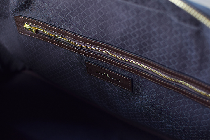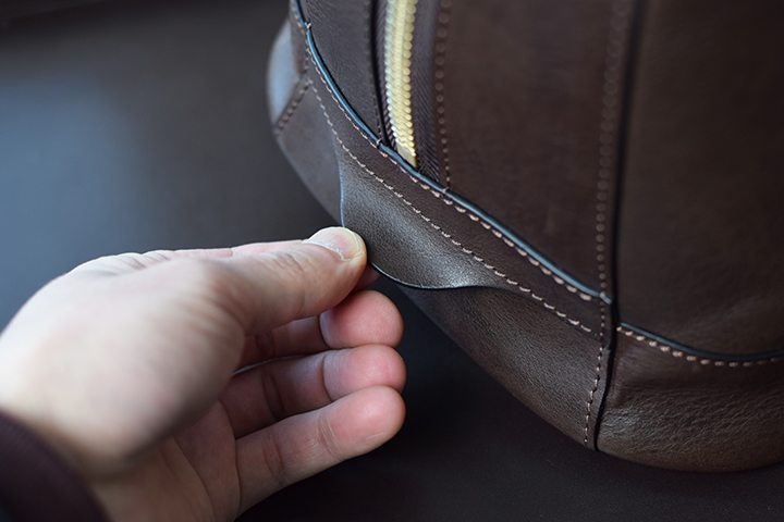 本体の両側側面下部には革の持ち手パーツを備えているので、ファスナーを閉じる際に片手でこちらを持ちながら、ファスナーを閉めることでスムーズな操作が可能となります。
